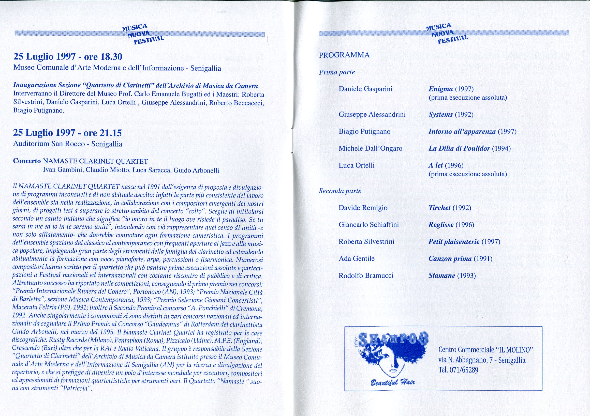 - “A lei” per quartetto di sassofoni/clarinetti (Pesaro, 1996)