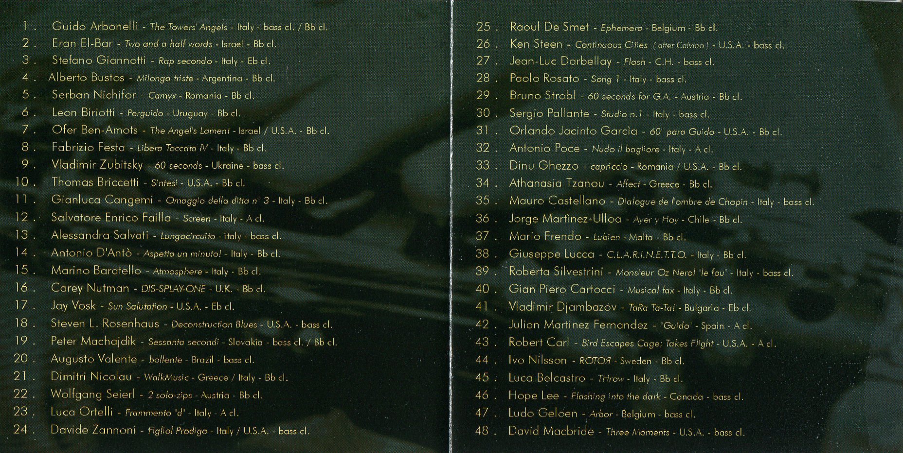- “Dual variations” per due clarinetti bassi in Sib e voci recitanti ad libitum (Bologna, 13/02/2026: attualmente non eseguito)